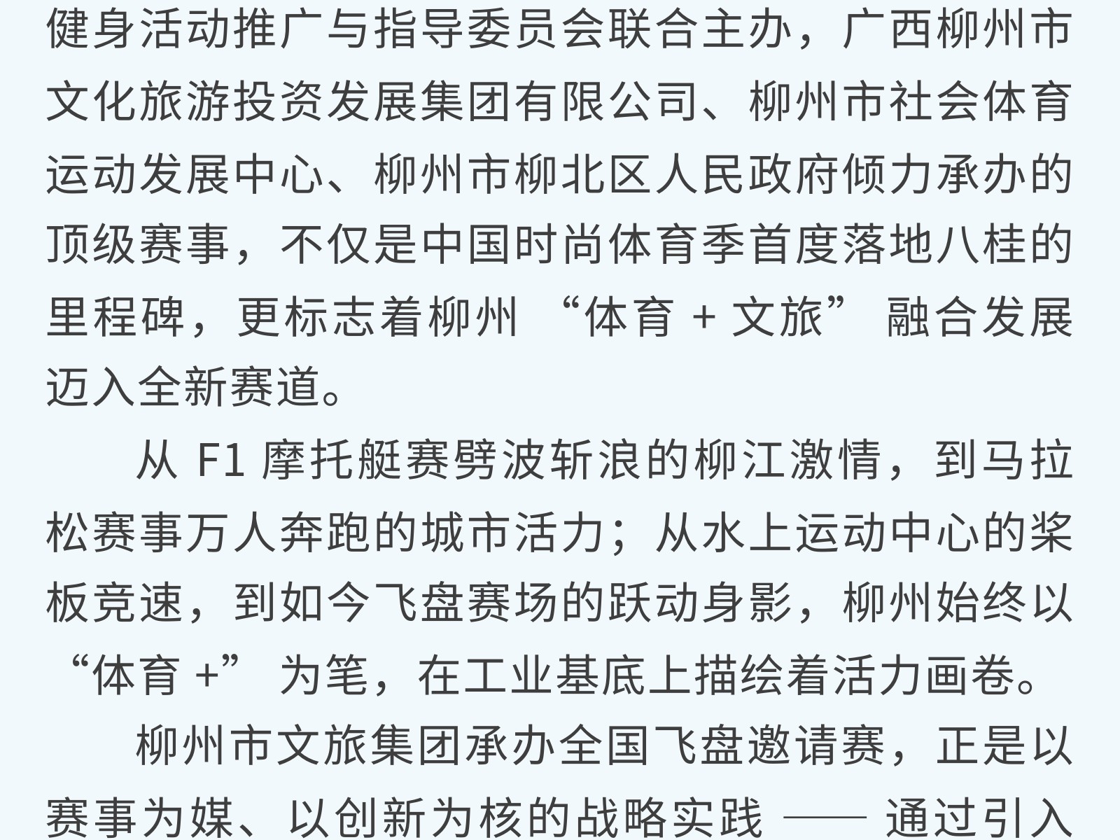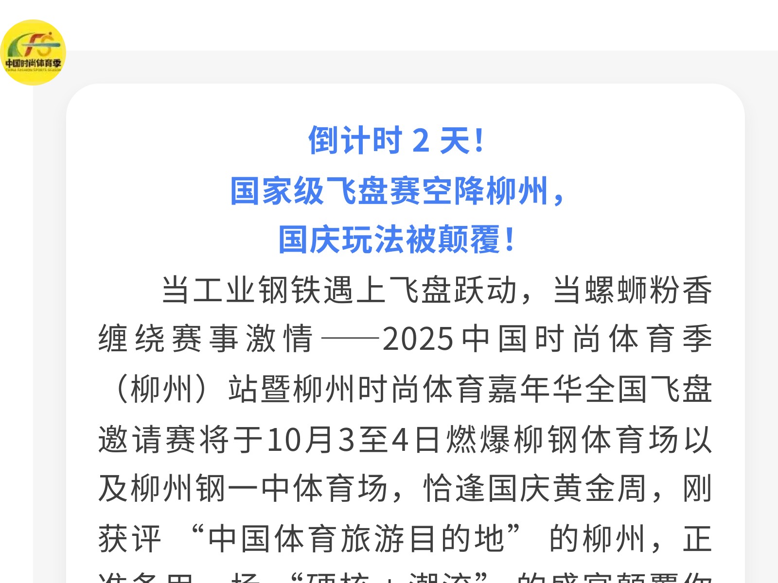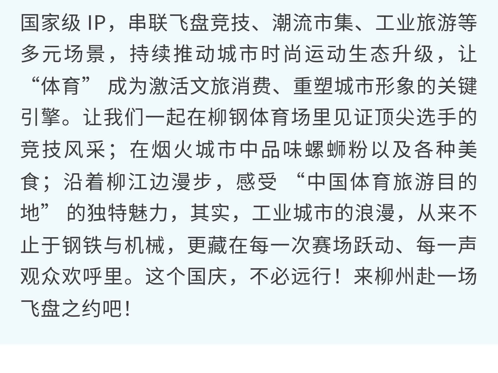 國慶赴柳!鋼鐵賽場飛盤燃,柳州這座體育旅游之城藏不住了 發(fā)布時間:2025年10月02日 17時來源:本站原創(chuàng)瀏覽:28 人次